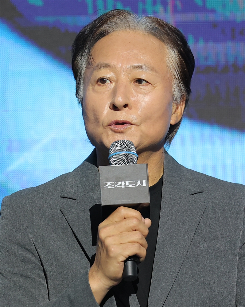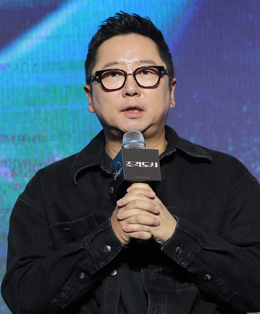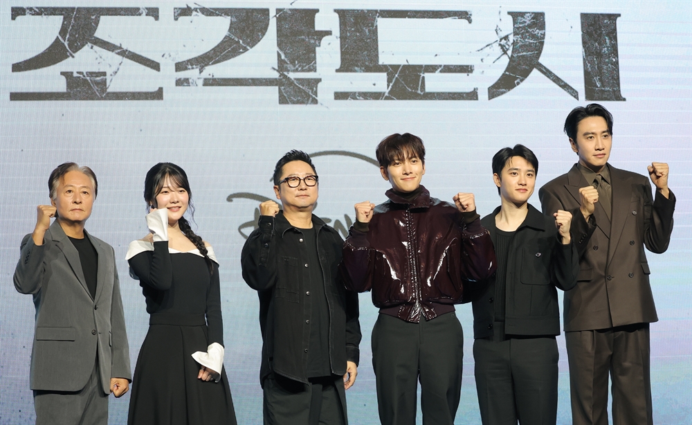 배우 김종수(왼쪽부터)와 조윤수, 박신우 PD, 지창욱, 도경수, 이광수가 3일 오전 서울 영등포구 콘래드 서울 호텔에서 열린 디즈니+ 오리지널 시리즈 ‘조각도시’(각본 오상호/연출 박신우) 제작발표회에서 포즈를 취하고 있다. ‘조각도시’는 평범한 삶을 살던 태중(지창욱 분)이 어느 날 억울하게 흉악한 범죄에 휘말려 감옥에 가게 되고, 모든 것은 요한(도경수 분)에 의해 계획되었다는 것을 알게 되면서 그를 향한 복수를 실행하는 액션 드라마다. 뉴스1