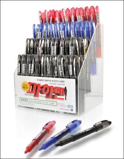 올해 문구업계의 최대 히트상품으로 꼽히고 있는 '마하펜'의 컬러타입 제품이 선보였다. 모닝글로리는 기존의 흑색 마하펜이 나온지 6개월만에 청색과 적색 2종의 컬러 마하펜(사진)을 출시한다고 9일 밝혔다. 컬러 마하펜은 기존 제품처럼 탱크형 잉크 카트리지가 적용돼 기존 볼펜이나 중성펜보다 필기거리가 약 5배나 길어 5,000m이상 사용할 수 있으며 부드럽고 균일한 굵기의 필기감을 자랑하고 있다. 회사측은 기존의 흑색 마하펜 출시 초기부터 컬러펜을 추가로 생산해달라는 소비자의 요청이 많아 청색 및 적색 펜을 출시하게 됐다고 설명했다. 지난 3월초 선보인 마하펜은 출시직후 일주일에 15만 자루가 판매되는 등 그동안 150만개나 팔려나가 필기류 가운데 최단기간 최고 판매기록을 갖고 있다. 회사 관계자는 "연말까지 녹색ㆍ보라ㆍ핑크 색상이 추가되고 '마하펜2' 시리즈 출시도 앞두고 있다"며 "컬러펜의 경우 펜 구입시 색상별로 단일 구매하는 소비패턴이 일반적이라 연내 400만개까지 판매량이 늘어날 것으로 예상된다"고 밝혔다.