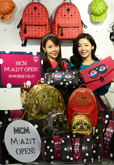 12일 잡화 브랜드 MCM이 서울 신사동에 새로 오픈한 컬쳐스토어 '마지트(M:AZIT)'에서 모델들이 MCM 럭키백을 선보이고 있다. MCM은 마지트 오픈을 기념해 오는 24일까지 매일 60~200만원 상당의 제품을 12만원에 선착순 판매하는 럭키백 이벤트를 진행한다.