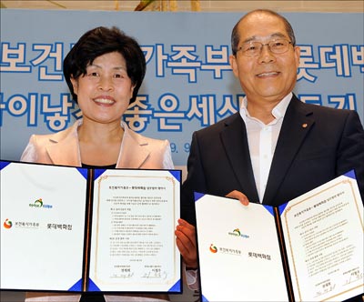 | | 이철우(오른쪽) 롯데백화점 사장과 전재희 보 건복지가족부 장관이 출산장려운동 MOU를 체결한 후 협약서를 들어 보이고 있다. /사진제공=롯데백화점 |