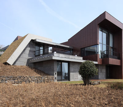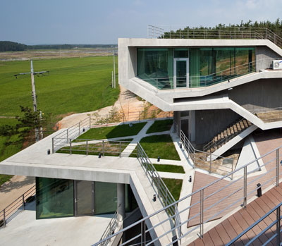 도시적 건축물이 평범한 야산자락 경사를 활용해 전원 속에서도 조화롭게 어우러질 수 있음을 잘 보여주고 있다. 경사면에 대응하는 강한 건물 선은 대지의 꿈틀대는 역동성을 옥상정원까지 이어주며 땅과 어우러진다. 양 옆의 벽을 통유리로 만들어 인근 전원의 풍경을 실내에서 즐길 수 있을 뿐 아니라, 채광효과도 극대화 했다. 또 탁 트인 시야를 통해 넓은 공간감을 느낄 수 있도록 했다. 노출 콘크리트의 통일성은 돋보이지만 실내 마감부분이 정밀하지 못한 점은 아쉬운 부분이다.
