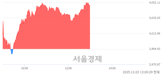3일 오후 1시 0분 현재 코스피는 전일 대비 54.10p(+1.35%) 상승한 4049.03로, 57(매도):43(매수)의 매도우위를 기록 중이다. (※매수비율(%)=매수잔량/잔량합계*100, 매수우위=매수비율>매도비율)