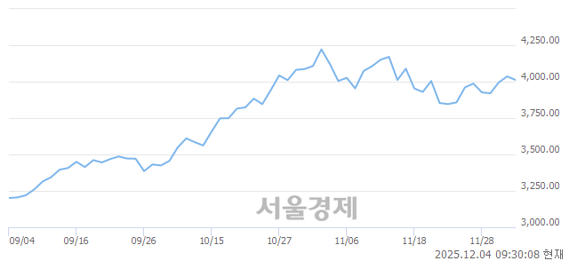 4일 오전 9시 30분 현재 코스피는 전일 대비 25.51p(-0.63%) 하락한 4010.79로, 44(매도):56(매수)의 매수우위를 기록 중이다. (※매수비율(%)=매수잔량/잔량합계*100, 매수우위=매수비율>매도비율)