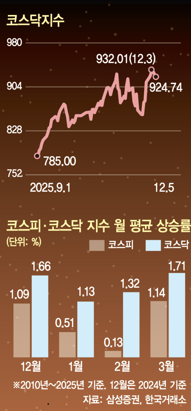 7일 한국거래소와 삼성증권에 따르면 2010년 이후 올해(12월은 2024년 기준)까지 12·1·2·3월 월 평균 수익률은 코스닥이 코스피 보다 높았다. 지난해 12월의 경우 코스피 지수는 1.09% 상승한 반면 코스닥은 1.66%를 기록했다. 1월과 2월도 유사한 흐름이 이어졌다. 1월은 코스닥 지수가 1.13% 상승률을 보일 때 코스피는 0.51%에 그쳤다. 2월 코스닥은 1.32% 수익률을 기록 반면 코스피 지수는 0.13%로 집계됐다. 그나마 3월에는 코스피 지수가 1.14%의 상승률을 보였지만 코스닥(1.71%) 보다는 낮았다. 4월부터 11월까지는 코스피의 월 평균 상승률이 코스닥 보다 모두 높았다.
