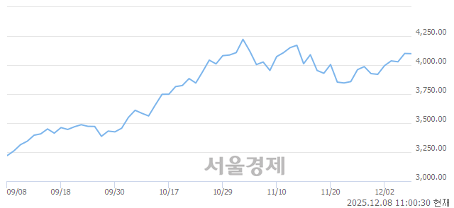 8일 오전 11시 0분 현재 코스피는 전일 대비 1.53p(-0.04%) 하락한 4098.52로, 40(매도):60(매수)의 매수우위를 기록 중이다. (※매수비율(%)=매수잔량/잔량합계*100, 매수우위=매수비율>매도비율)
