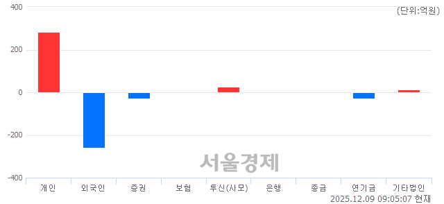 투자자별 동향을 살펴보면, 개인과 기관 동반 매수세를 보이고 있으나, 외국인의 '팔자' 기조에 밀리고 있다. 개인은 281억, 기관은 32억을 순매수 중이며, 외국인은 333억을 순매도하고 있다.