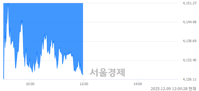 9일 오후 12시 0분 현재 코스피는 전일 대비 28.37p(-0.68%) 하락한 4126.48로, 41(매도):59(매수)의 매수우위를 기록 중이다. (※매수비율(%)=매수잔량/잔량합계*100, 매수우위=매수비율>매도비율)