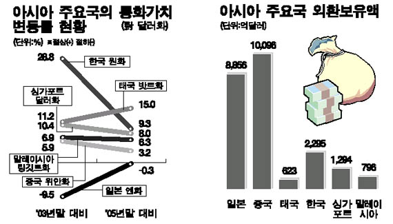 ‘중국과 일본 때문에 애꿎은 아시아 국가들이 미국의 희생양이 되고 있다.’ 미국이 겉으로는 중국ㆍ일본과 같은 경제 대국들과 통화 전쟁을 벌이고 있는 척하지만 정작 당사국들은 압력에서 슬쩍 비켜나가고 한국ㆍ태국 등 주변 아시아 국가들만 피해를 보고 있다는 지적이 고개를 들고 있다. 최근 태국 밧화 사태 역시 일본과 중국이 제 역할을 못하면서 생긴 극단적인 사건이라는 것이다. 올 들어 아시아 주요국의 통화 변동률을 보면 엔화를 제외한 대부분의 통화들이 달러화 대비 강세를 보이고 있다. 달러화에 대한 원화 환율(20일 현재 925원80전)은 지난해 말(1,011원60전)보다 9.3%나 절상됐다. 같은 기간 아시아 국가 중 달러화 대비 절상폭이 가장 큰 곳은 태국 밧화였다. 밧화의 절상폭은 15.0%였으며 5년 전에 비하면 그 폭이 무려 23.9%에 달한다. 싱가포르 달러화도 지난해 말보다 8.0%나 절상됐다. 반면 중국 위안화는 미국의 거센 절상 압력에도 불구하고 3.2% 절상되는 데 그쳤다. 겉으로는 중국과 미국간 통화 전쟁이 치열하게 전개되는 것 같지만 실제 위안화 절상폭은 다른 나라에 비하면 말 그대로 손톱만큼만 이뤄진 셈이다. 일본 엔화의 움직임은 더욱 심해 ‘글로벌 달러 약세’라는 말을 무색하게 만들 정도다. 20일 현재 엔ㆍ달러 환율은 달러당 118.17엔으로 지난해 말 대비 0.3% 절하됐다. 지난 2003년 말(106.92엔)과 비교할 경우 절하폭은 9.5%에 달한다. 반면 같은 기간 원화 환율의 절상폭은 무려 28.8%(1,192원60전→925원80전)에 달했다. 지난해까지만 해도 상당수 국제 투자은행(IB)들은 올해 엔화가 105엔대까지 절상될 것으로 예상했지만 지금은 이런 전망이 사라진 지 오래다. 엔화의 ‘나 홀로 약세’ 현상은 외형상으로는 제로 금리인 일본의 낮은 금리를 활용해 엔화를 빌린 다음 금리가 높은 다른 나라 자산에 투자하는 ‘엔 캐리 트레이드’ 때문으로 분석되고 있지만 실상은 미국과의 밀월관계에 따른 보은(報恩)이 아니겠느냐는 시각도 적지않다. 정영식 삼성경제연구소 수석연구원은 “동아시아 안보에 있어 일본이 맡고 있는 역할 때문에 미국이 일본에 경제우호적인 환경(엔화 약세 용인)을 제공해주는 것 아니냐는 일부의 지적이 의미가 있는 것 같다”고 말했다. 일각에서는 역외 투기세력들이 일본과 중국 외환시장에서 이익 추구를 하려다 실패하자 다른 아시아 국가로 몰려들고 있기 때문이라는 분석도 내놓고 있다. 문제는 엔화와 위안화를 제외한 아시아 통화 절상 현상이 언제까지 지속되느냐다. 오재권 한국은행 외환시장팀장은 “중국이 위안화 추가 절상을 급격히 용인하고 있는데다 일본의 저금리 정책도 조만간 끝날 것으로 보여 내년부터 여타 아시아에 주어진 부담은 완화될 것으로 보인다”고 진단했다. 그는 “다만 위안화와 엔화가 실제 절상될 경우 다른 국가들의 통화도 추가 절상압력에 시달릴 가능성은 여전히 남아 있다”고 덧붙였다. 쌍둥이 무역적자 개선을 원하는 미국을 달래기 위한 다른 아시아 국가들의 노력(절상압력)이 내년에도 계속될 경우 ‘제2의 태국 밧화’ 사건이 재연될 가능성을 완전히 배제할 수 없다는 것이다. 이 때문인지 인터내셔널헤럴드트리뷴(IHT)은 20일 “강력한 외환규제책을 발표한 태국에 이어 한국도 원화 평가절상을 막기 위한 규제책 도입 압력이 가중되고 있다”는 보도를 내보내기도 했다. 물론 태국은 하루 만에 그 같은 조치를 번복하기는 했다.