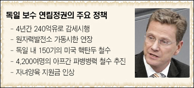 독일 총선에서 승리한 기민당(CDU)-기사당(CSU) 연합과 자민당(FDP)이 24일(현지시간) 보수연정 구성을 최종 마무리 지었다. 이날 양측은 귀도 베스터벨레(사진) 자민당 당수를 차기 부총리 겸 외무장관으로 전격 지명하고, 가장 관심이 모아진 재무장관에는 볼프강 쇼이블레 현 내무장관을 기용한 것으로 전해졌다. 쇼이블레 장관은 독일 하원의원 가운데 최다선(11선)으로 1990년 독일 통일 당시 서독 내무장관 신분으로 통일조약에 서명한 바 있는 기민당의 원로 정치인이다. 24일 독일 언론들은 지난달 27일 총선승리 이후 한 달여 가까운 협상 끝에 기민당 중심의 독일 연립정권이 마침내 차기 정부의 핵심 정책에 대한 합의에 도달했다고 보도했다. 이에 따라 앙겔라 메르켈 독일 총리는 새로운 연정파트너인 기사당ㆍ자민당과 함께 이르면 25일 집권 2기 정부를 공식출범시킬 예정이다. 먼저 연립정권은 정당간 입장이 엇갈렸던 사항인 세금문제와 관련, 감세규모를 향후 4년간 240억유로로 책정하기로 의견을 모았다. 총선 당시 기민당-기사당 연합은 서민층 지원을 위해 150억유로의 세금감면을 공약으로 내건 반면, 자민당은 소득세ㆍ법인세 등의 전반적인 인하를 통해 350억유로의 감세를 약속했었다. 세금감면은 주로 저소득층과 중산층, 자녀가 있는 가구들에 혜택이 돌아갈 것으로 전망된다. 반면 세금문제를 제외한 다른 분야에서는 비교적 쉽게 합의가 이뤄졌다. 기민당-기사당 연합은 총선 공약인 '원자력발전소 가동시한 연장'을 추진하기 위해 2021년까지 원전 17기의 가동을 모두 중단하기로 한 대연정 시절의 정책을 폐기하기로 했다. 또한 공공의료보험 개혁에서도 큰 틀의 합의를 이뤘으며, 자녀양육 지원금도 인상하기로 의견을 일치했다. 외교분야에서는 독일의 독자적 입장을 더욱 강화하기로 했다. 차기 부총리겸 외무장관으로 지명된 귀도 베스터벨레 자민당 당수는 이날 "독일에 배치돼 있는 150기 미국 핵탄두의 철수 방침을 기존 입장대로 추진할 것"이라고 밝혔다. 또한 아프가니스탄에 주둔한 현 4,200여명의 파병병력을 철수하기 위해 아프간 정부에 압박을 강화하겠다고 밝혀 미국과의 마찰을 예고했다. 다만 터키의 유럽연합(EU) 가입에 대해서는 현 정부의 정책을 그대로 이어받아 가입을 반대하지는 않기로 했다. 현 정부는 EU와 터키의 협상 결과를 따르되 만약 EU가 가입을 거부하면 터키에 준회원격인 '특별동반자 관계'를 부여해야 한다는 입장이다. 메르켈 총리는 이날 기자회견에서 "우리가 좋은 팀이 될 것으로 믿는다"며 "새 연정이 우리 앞에 놓여 있는 문제들을 용감하게 풀어나갈 것"이라고 기대했다. 귀도 베스터벨레 자민당 당수도 "(이번 합의가) 독일을 위한 위대한 나침반"이라고 의미를 부여했다. 한편 이날 독일 언론들이 보도한 연립정권의 차기 내각에 참여할 주요 인사들의 면면을 보면, 차기 총리는 예정대로 기민당 당수인 앙겔라 메르켈 현 총리가, 부총리 겸 외무장관은 연정 소수 파트너인 자민당의 귀도 베스터벨레 당수가 맡게 됐다. 또한 재무장관에는 볼프강 쇼이블레 현 내무장관이, 내무장관에는 토마스 드 메지에르 현 총리 비서실장이, 칼-테오도르 추 구텐베르크 현 경제장관은 국방부로 자리를 옮길 것으로 보인다. 보건장관으로는 자민당 소속의 베트남계 정치인 필립 뢰슬러가 유력하다. 베트남에서 태어나 독일로 입양된 그는 독일 역사상 최초의 아시아계 장관이자 최연소(36) 각료로 기록되게 된다.
