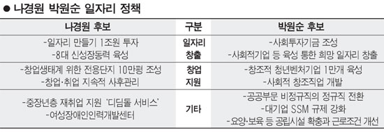 나경원 한나라당 후보는 성장을 통한 일자리 창출을, 박원순 야권단일후보는 일자리 나눔을 통한 성장을 각각 모색하고 있다. 우선 나 후보는 일자리 창출을 위해 전통산업과 도심산업에 문화를 입혀 가치를 높일 계획이다. 미래 성장동력 차원에서 정보기술(IT), 생명공학(BT), 디자인패션 등 8대 분야를 지원하고 관광산업 육성의지도 밝혔으나 아직까지 구체적인 계획은 내놓지 않고 있다. 특히 40~50대 조기퇴직자의 창업이나 재취업 차원에서 프랜차이즈 불공정 시정이나 컨설팅을 통한 일자리 알선에 나서기로 했다. 사회적 기업을 육성하고 여성ㆍ장애인의 취업능력을 향상시키기 위한 여성ㆍ장애인 인력지원센터도 가동하기로 했다. 하지만 박 후보 측은 "이명박ㆍ오세훈 전 시장도 일자리 창출을 내세웠지만 말뿐이었다"라고 꼬집었다. 박 후보는 '아름다운 가게' 등 사회적 기업들을 창출한 경험을 살려 서울형 마을기업, 협동조합, 사회적 기업 등의 육성에 나설 방침이다. 창조성과 상상력을 발휘한 서울경제 점프업(Jump up) 공약도 내놓았다. 또한 조정권한을 적극 발휘해 기업형 슈퍼마켓(SSM)을 규제, 중소 영세상인과 재래시장을 보호할 것임도 공약했다. 기존 일자리의 질을 높이기 위해 시 산하 공공기업의 비정규직을 정규직으로 전환할 계획이다. 산학연관 창조적 인재육성위원회도 설치하고 서울 소재 2년제 전문기술대의 경쟁력을 높이는 한편 저소득층 학자금 지원을 늘릴 방침이다. 요양ㆍ간병ㆍ보육 분야 공립시설 확충과 종사자 근로조건 개선도 약속했다. 그러나 나 후보 측은 "일자리를 나누는 것은 좋지만 성장을 통한 일자리 창출 부분이 약하다"고 비판했다. 또한 청년창업 활성화를 위해 나 후보는 총 10만평의 전용단지를 조성하기로 했다. 시가 보유한 땅 등을 활용해 대학 밀집지역 등에 청년창업단지를 조성해 산업 클러스터를 구축하자는 것이다. 창업실패시 채무재조정 지원도 하기로 했다. 이에 박 후보 측은 "마곡첨단산업단지 30만평도 분양이 잘되지 않는데 지금 공간이 없어 일자리가 없느냐"며 하드웨어식 접근이라고 반박하지만 나 후보 측은 청년들이 창업공간 마련과 재기 프로그램에 관심이 많다고 맞선다. 박 후보는 창조적 청년벤처기업 1만개 육성과 지속 가능한 좋은 일자리 육성을 위한 '사회투자기금' 조성을 공약했다. 시가 예산을 내놓고 기업 등이 매칭펀드식으로 출연하도록 하겠다는 것이다. 다만 창업실패 이후 대책에 대해서는 명확한 입장이 보이지 않는다. 박 후보 측은 "하나희망재단에 300억원의 투자를 받아 영세 취약계층을 지원했고 희망제작소를 통해 청년벤처와 사회적 기업을 많이 만들어 일자리를 창출했다"고 자신했다. 하지만 나 후보 측은 "과거 정부에서 영화 모태펀드를 했지만 모럴해저드(도덕적 해이)가 많았다"고 지적했다. 이광재 한국매니페스토협회 사무총장은 "일자리 정책 중 가장 중요한 부분이 청년 일자리인데 두 후보 모두 창업만 강조할 것이 아니라 일자리 나눔과 창업을 같이 얘기해야 한다"고 지적했다.