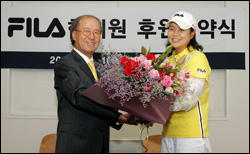 한희원, 휠라와 3년 재계약 ▲ 윤윤수 휠라코리아 회장과 한희원이 1일 서초동 휠라 사옥에서 후원계약을 체결한 뒤 포즈를 취하고 있다. 올 시즌 2승을 포함해 미국 LPGA투어에서 통산 6승을 올린 한희원(28)이 계속해서 휠라 로고를 달고 뛴다. 지난 2001년부터 휠라의 후원을 받아온 한희원은 1일 휠라코리아와 재계약 조인식을 가졌다. 계약 기간은 내년부터 오는 2009년까지 3년간이며 의류와 용품 등을 포함한 후원금은 지난 3년간 받았던 연간 10억원과 비슷한 규모라고 휠라코리아측은 밝혔다. 한희원은 2일 오전11시 서울 광장동 워커힐 골프연습장에서 휠라 고객 초청 골프 클리닉 행사를 갖는다. 3일부터 일본에서 열리는 미즈노클래식에는 출전하지 않고 오는 6일 미국으로 돌아갈 예정이다. [사진설명] 윤윤수 휠라코리아 회장과 한희원이 1일 서초동 휠라 사옥에서 후원계약을 체결한 뒤 포즈를 취하고 있다. 박민영기자 입력시간 : 2006-11-01 16:33:49