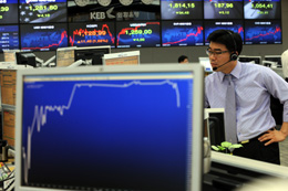 | | 2008년 마지막 외환시장이 열린 30일 서울 명동의 외환은행 본점 글로벌마켓영업부 딜러들이 분주한 모습을 보이고 있다. /이호재기자 |