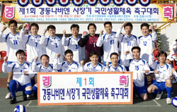 | | 지난달 열린‘제1회 경동나비엔 국민생활체육 축구대회’에 참석한 서울지역의 축구 동호회원들이 주먹을 쥐고 파이팅을 외치고 있다. |