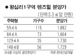 27일 업계에 따르면 28일 1ㆍ2순위 청약에 나서는 서울 성동구 왕십리1구역 텐즈힐 아파트 148㎡B타입(이하 전용면적) 4층 이상의 3.3㎡당 평균분양가는 1,729만원으로 책정됐다. 이는 이 아파트 중소형보다 153만원이나 저렴한 것이다.