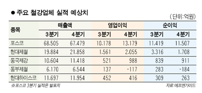 포스코가 올 하반기에 시장예상치를 웃도는 실적을 거둘 것으로 기대를 모으면서 철강주 전체가 승승장구하고 있다. 15일 철강·금속 업종 지수는 전날보다 3.18% 오른 6,490.77을 기록, 한달 만에 연고점을 경신했다. 특히 환율하락의 여파로 수출주들의 오름세가 주춤한 가운데 이틀째 독보적인 업종 상승률을 기록했다. 전문가들은 철강가격 상승 및 원가절감 효과 등을 이유로 올 4·4분기와 내년 철강업황이 긍정적일 것이라는 데 대체로 공감하는 분위기다. 하지만 철강주의 주가 향방에 대해서는 최근 주가가 급격히 오른 만큼 신중한 접근을 요구하고 있다. ◇철강주 포스코 효과로 2거래일째 급등=철강·금속업종은 전일 4.0% 오른 데 이어 이날 또다시 3.18%나 급등, 다른 업종의 상승률을 압도했다. 종목별로는 대장주인 포스코가 3.69% 상승한 것을 비롯해 문배철강(8.49%), DSR제강(7.21%), 부국철강(4.98%), 현대하이스코(4.25%), 한국철강(3.73%), 대한제강(3.68%), 동국제강(3.13%), 현대제철(3.06%), 한일철강(2.80%), BNG스틸(2.78%), 동부제철(2.04%) 등 대부분의 철강ㆍ금속주가 강세를 보였다. 특히 외국인과 기관은 포스코와 현대제철ㆍ현대하이스코 등을 나란히 순매수 상위리스트에 올리는 등 철강주에 대해 집중적인 관심을 보였다. 철강주가 연 이틀 급등한 것은 지난 14일 발표된 포스코의 올 3·4분기 실적이 시장예상치에 부합한데다가 같은 날 제시된 4·4분기 가이던스(기업 실적 예상전망치)가 시장예상치를 훨씬 뛰어넘는 것으로 나타났기 때문으로 풀이된다. 증권업계에 따르면 이날 포스코가 밝힌 올 4·4분기 예상 영업이익은 약 1조7,000억원에 달해 기존 시장예상치였던 1조3,000억원을 크게 상회했다. 정지윤 하이투자증권 연구원은 "포스코의 4·4분기 실적전망치가 시장예상치를 훨씬 뛰어넘은 것에 대한 기대감이 최근 주가에 가장 큰 영향을 미친 것으로 판단된다"며 "포스코 효과로 시장에서 철강업황 전체를 긍정적으로 바라보기 시작한 것 같다"고 분석했다. 전문가들은 포스코가 시장예상치보다 뛰어난 실적을 거둘 것으로 전망되는 요인으로 ▦글로벌 철강가격의 점진적인 상승 ▦원재료 가격 하락 효과 ▦원화강세 수혜 ▦중국의 경기부양책에 따른 수요 증가 등을 꼽았다. 철강가격의 경우 선진국을 중심으로 가격이 서서히 오르는 추세에 있으며 최근 약세를 보이는 중국 철강 가격도 이미 바닥에 도달했다는 분석이 제기됐다. 또 지난해보다 대폭 하락한 원재료가격이 올 하반기 실적부터 100% 반영되는 점과 올 들어 포스코가 원가절감을 위해 전사적으로 노력한 점도 실적개선의 주요 요인으로 평가됐다. ◇추가적인 주가상승에 대해서는 신중론 우세=그러나 증권가에는 전반적인 철강업황이 호전될 것으로 예상됨에도 불구하고 주가 전망에 대해서는 "좀더 지켜볼 필요가 있다"는 의견이 주류를 형성하고 있다. 정 연구원은 "철강주의 4·4분기 실적개선이 기대되지만 최근 이틀 동안 주가가 지나치게 급등해 당분간은 관망하는 자세가 요구된다"고 조언했다. 김종재 키움증권 연구원은 "그동안 철강업종이 실적 대비 저평가된 측면이 있어 최근 주가가 빠르게 올랐다"며 "하지만 철강업종은 실적보다는 전체 업황이 중요하기 때문에 다음주부터는 다시 글로벌 철강업계의 동향에 영향을 받을 가능성이 크다"고 말했다.
