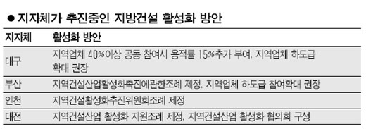 지방자치단체가 지방 건설산업 활성화에 안간힘을 쏟고 있다. 건설산업은 고용창출과 전ㆍ후방 생산유발 등의 효과가 큰 ‘지역밀착형산업’이지만 최근 몇 년 사이 수도권의 대형건설사들에 밀려 지방 건설사들이 상대적으로 크게 위축됐기 때문. 실제로 대한건설협회 대구시회의 경우 소속 157개 회원사 중 올 들어 단 1건의 공사도 수주하지 못한 업체가 38%인 60개사에 달하고 있다. 이 때문에 지자체들은 지방 건설산업을 활성화할 수 있는 별도의 조례를 만들거나 대형건설사들이 지역업체와 컨소시엄을 구성해 사업에 참여할 경우 ‘용적률 완화 인센티브’를 부여하는 등 지방 건설사 살리기에 주력하고 있다. 대구시는 지역건설업체가 재개발ㆍ재건축, 도시ㆍ주거환경정비 등 각종 도시정비사업에 단독 또는 공동으로 참여할 경우 부여하는 용적률 인센티브를 확대키로 했다. 즉, 지역업체의 참여비율이 40%이상일 경우 15%의 용적률을 추가 부여하겠다는 것. 또 30%이상일 때는 12%, 25%이상일 때는 10%, 20%이상일 때는 7%의 용적률 인센티브를 각각 부여할 예정이다. 현재는 지역업체 참여비율이 20%일 때 5%의 용적률 인센티브를 주고 있다. 대구시는 이와 함께 기초지자체가 사업승인을 내줄 때 지역업체의 하도급 비율을 확대해 줄 것도 적극 권장하고 있다. 대구시의회는 지역건설산업 활성화를 위한 조례 제정을 의원 발의를 통해 추진중이다. 이 조례에는 지역건설활성화추진위원회 구성ㆍ운영, 우수 업체 및 건설인 표창, 건설 기업인 예우 등과 관련된 내용이 담길 예정이다. 부산시도 지난 4월 ‘지역건설산업 활성화 촉진에 관한 조례’를 제정했다. 이 조례에 따라 ‘지역건설산업발전위원회’를 구성해 경쟁력 있는 지역건설업체의 지원ㆍ육성, 지역업체 수주율 제고, 애로사항 수렴 및 해소, 건설 관련 제도개선 및 법령 개정 건의 등을 추진하고 있다. 또 대구와 마찬가지로 각종 정비사업에 대한 지역업체의 참여비율에 따라 용적률 인센티브도 주고 있다. 인천시는 이미 지난 2004년 9월 ‘지역건설활성화추진위원회조례’를 만들어 지역건설 활성화를 위한 다양한 방안을 추진 중이다. 건설협회 대구시회 관계자는 “지역 건설업의 활성화를 위해서는 업계 내부의 경쟁력 강화와 함께 규제완화, 발주물량 및 건설투자비중 확대, 과도한 실적위주의 입찰제도 개선 등 정부와 지자체의 노력도 반드시 필요하다”고 말했다.