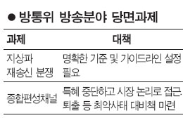 ▦종편 특혜 정책 재검토 시급 =방통위가 공들인 작품인 종합편성채널 또한 손봐야 곳 투성이다. 종편 사업자를 시장 규모에 비해 과도하게 선정한 후 이들을 지원하기 위한 무리한 지원책을 내놓으며 미디어 시장을 황폐화시켰다는 지적을 받고 있다. 미디어렙 법안, 황금재채널 배정, 방송발전기금 납부 유예 등 방통위의 온갖 퍼주기 정책에도 불구하고 출범 3개월이 다 돼가는 종편의 평균 시청률은 1%에도 못 미치고 있다. 한국신용평가는 각 종편사가 매년 1,000억 원대의 적자가 불가피하다는 분석자료를 내놓기도 했다.