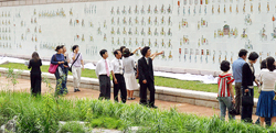 | | 청계천을 찾은 시민들이 정조대왕 능행 반차도가 그려진 도자벽화를 감상하고 있다. |