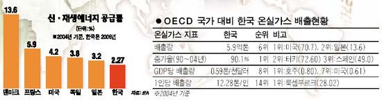 이명박 대통령의 ‘저탄소 녹색성장’ 비전 선언은 온실가스 감축을 피할 수 없다면 능동적으로 대응, 기후변화를 새로운 경제성장동력으로 삼겠다는 것으로 해석되고 있다. 한국이 오는 2013년 이후부터 온실가스 의무 감축국으로 편입될 가능성이 높은 가운데 우리가 주도적으로 저탄소 경제 시스템으로 패러다임을 전환, 이 과정에서 녹색산업 육성 등 새로운 먹거리를 찾겠다는 의도다. 이 대통령은 이미 지난 7월 초 일본에서 열린 G8확대정상회의에서 내년에 한국도 국가적인 온실가스 감축목표를 발표하겠다고 예고했었다. 아울러 그 이면에는 3차 오일 쇼크 등 치솟는 기름 값으로 인해 현재와 같은 화석연료(석유ㆍ석탄 등) 위주의 경제 시스템으로는 성장이 한계에 부딪힐 수밖에 없다는 절박감도 내포돼 있다. 하지만 우리나라 산업구조는 조선ㆍ철강ㆍ자동차ㆍ석유화학 등 에너지 다소비업종을 중심으로 하고 있다. 이에 따라 ‘저탄소 녹색성장’으로 전환하는 과정에서 기업의 부담증가, 경제성장률 감소 등 심각한 후유증도 불가피한 것이 현실이다. 전국경제인연합회 등은 국가적인 온실가스 감축목표 대신 일본과 같이 기업의 자발적인 감축 중심으로 온실가스 대책을 수립해야 한다고 주장하고 있다. ◇저탄소ㆍ녹색성장, 비전 왜 나왔나=유럽을 중심으로 선진국들은 이미 온실가스 감축 시스템을 구축하며 기후변화 경제를 이끌고 있다. 특히 이들 국가는 탄소배출권 시장, 그린 에너지 투자 등을 통해 온실가스를 감축하고 새로운 산업도 만들어내며 기후변화와 성장이라는 두 마리 토끼를 잡고 있다. 실제 KOTRA의 분석에 의하면 독일은 매년 태양광 원천기술 개발에 10억유로가량을 투자하며 이 분야에서 세계 1위의 국가로 성장했다. 독일의 태양광 산업은 2007년에만도 1만1,000개의 일자리를 창출했으며 4만1,000명이 종사하고 있다. 아울러 기후변화 선진국을 중심으로 온실가스를 감축하지 않은 국가와 기업에 대해서는 까다로운 환경기준을 제시하는 등 기후변화가 새로운 무역장벽으로 급부상하고 있다. 미국 상원 보고서에 따르면 태양광의 경우 일자리 창출 효과가 전통산업 대비 7~8배나 되는 것으로 나타났다. 신재생 에너지 개발 등 ‘녹색기술(Green Technology)’ 시장은 2005년 1조유로였지만 고유가 시대가 도래함에 따라 2020년에는 2조2,000억유로(약 3,000조원)로 성장할 것으로 예상된다. 온실가스 감축은 이처럼 우리에게 위기인 동시에 기회의 측면이 있기 때문에 이 대통령의 ‘녹색성장’ 선언은 이를 오히려 적극 활용, 한국경제의 새로운 도약의 발판으로 삼겠다는 의미다. ◇기후변화종합대책, 9월 중 마련=이 대통령은 이 같은 비전하에 세부 대책도 제시했다. 우선 5% 남짓한 에너지 자주개발률을 임기 중에 18%, 2050년에는 50% 이상으로 끌어올릴 계획이다. 신재생 에너지 사용비율도 현재 2%대에서 2030년에는 11% 이상으로 높일 방침이다. 이 같은 비전 아래 이른바 신재생 에너지 등 녹색기술 연구개발과 투자에 적극 나서 2020년께 녹색기술 시장 규모를 3조원까지 끌어올린다는 비전도 내놓았다. 특히 한국의 주력 산업 중 하나인 자동차 산업에서 일명 ‘그린 카’를 중점 육성, 세계 4대 ‘그린 카’ 강국 청사진도 내놓았다. ‘그린 카’란 하이브리드차와 클린디젤ㆍ수소연료차 등 친환경 고효율 자동차로 석유시대 종말에 대비해 도요타와 제너럴모터스(GM), 포드, 혼다, 다임러 등 미국과 일본ㆍ독일의 자동차업체들이 이미 개발에 주력하고 있다. 이에 따라 정부는 ‘그린 카’ 4대 강국을 목표로 핵심기술의 연구개발과 부품업체 양산기반 조성을 지원하는 등 발전전략을 조만간 발표할 계획이다. 특히 정부는 9월 중에 이 같은 저탄소 경제로의 패러다임 전환을 본격적으로 알리는 ‘기후변화종합대책’을 내놓을 계획이다. 이 대통령은 “대담하고 신속하게 나아간다면 반드시 녹색강국으로 거듭날 수 있다”고 말했다. ◇한국 저탄소 경제, 한계와 부작용=저탄소 경제로의 전환은 우리 입장에서는 피할 수 없는 현실이다. 하지만 한국경제가 ‘저탄소 녹색성장’을 이루기 위해서는 넘어야 할 산이 적지 않다. 당장 온실가스 감축은 기업 등을 중심으로 적잖은 비용지출을 수반하며 경제성장률을 떨어뜨리는 요소로 작용할 수밖에 없다. 삼성경제연구소는 한국이 온실가스 의무 감축국이 돼 2013년부터 시작되는 교토의정서 2차 의무감축기간 중 1995년 대비 5% 감축 의무가 부과될 경우 연간 최대 82억달러(8조원)의 비용부담이 발생하는 것으로 추정했다. 이 경우 실질GNP 성장률은 0.78% 감소할 것이라고 주장했다. 조선ㆍ철강ㆍ석유화학 등 에너지 다소비 산업이 한국의 주력 산업을 형성하고 있는 상황에서 이 같은 부작용은 피할 수 없다는 것이 정설이다. 특히 상대적으로 열악한 중소기업의 경우 더 큰 타격을 받을 것으로 보인다. 또한 성급한 녹색산업 육성은 한국을 만성적 녹색기술 후진국으로 만들어놓을 수도 있다. 단적인 예로 현재 우리나라는 신재생 에너지 중 태양광 산업을 집중 육성하고 있지만 원천기술이 확보되지 않은 상태에서 산업을 급작스레 키우다 보니 독일 등